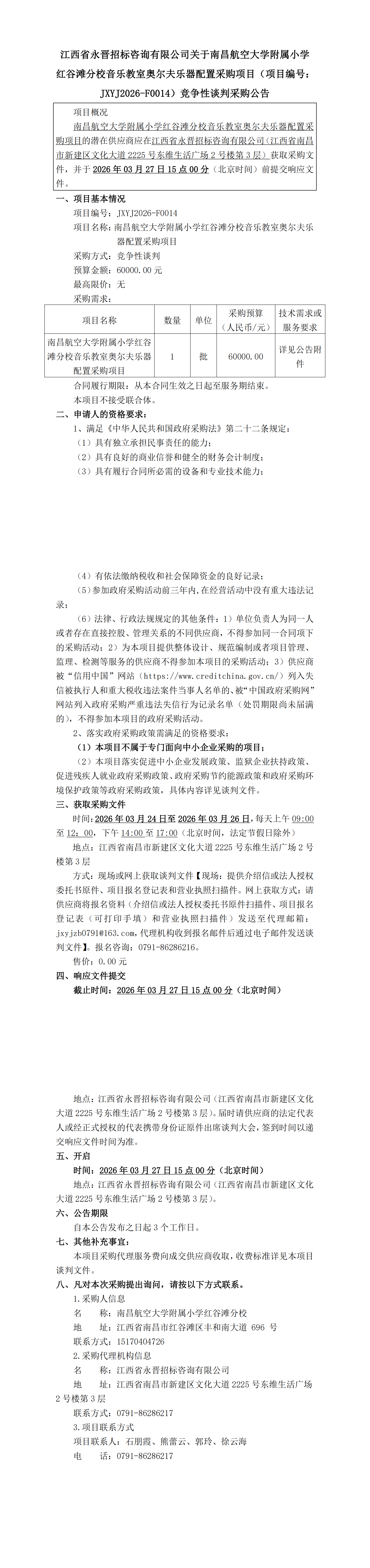 中国·yl23411永利关于南昌航空大学附属小学红谷滩分校音乐教室奥尔夫乐器配置采购项目(项目编号:JXYJ2026-F0014)竞争性谈判采购公告