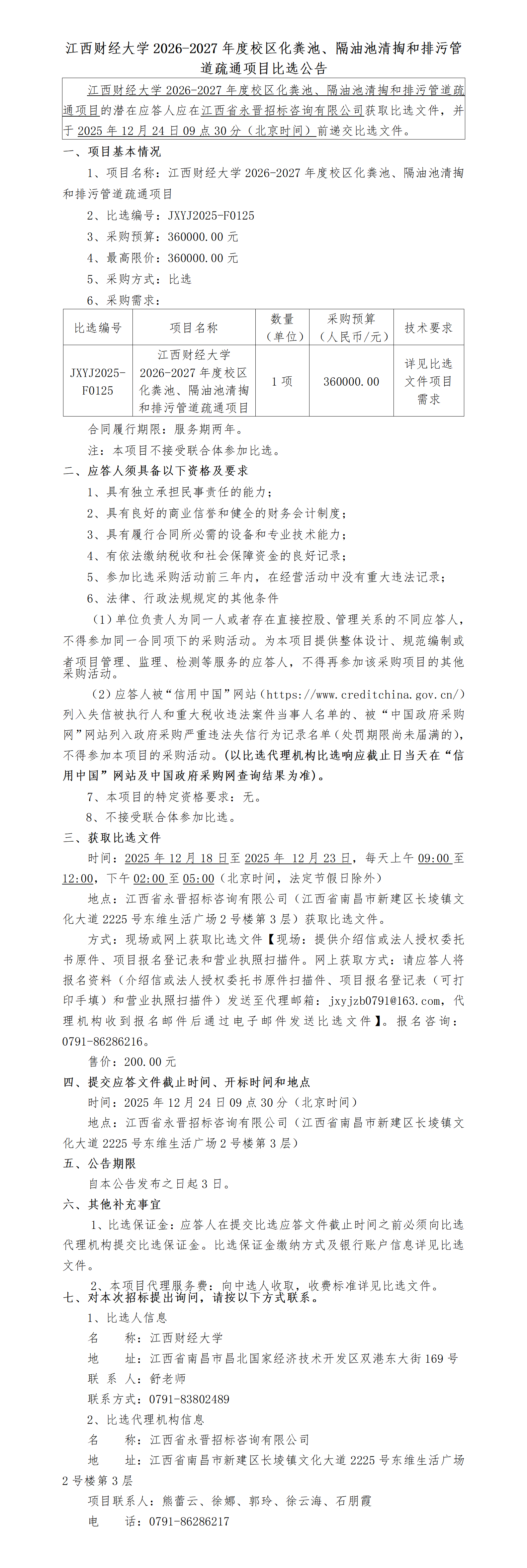 江西财经大学2026-2027年度校区化粪池、隔油池清掏和排污管道疏通项目(比选编号:JXYJ2025-F0125)比选公告