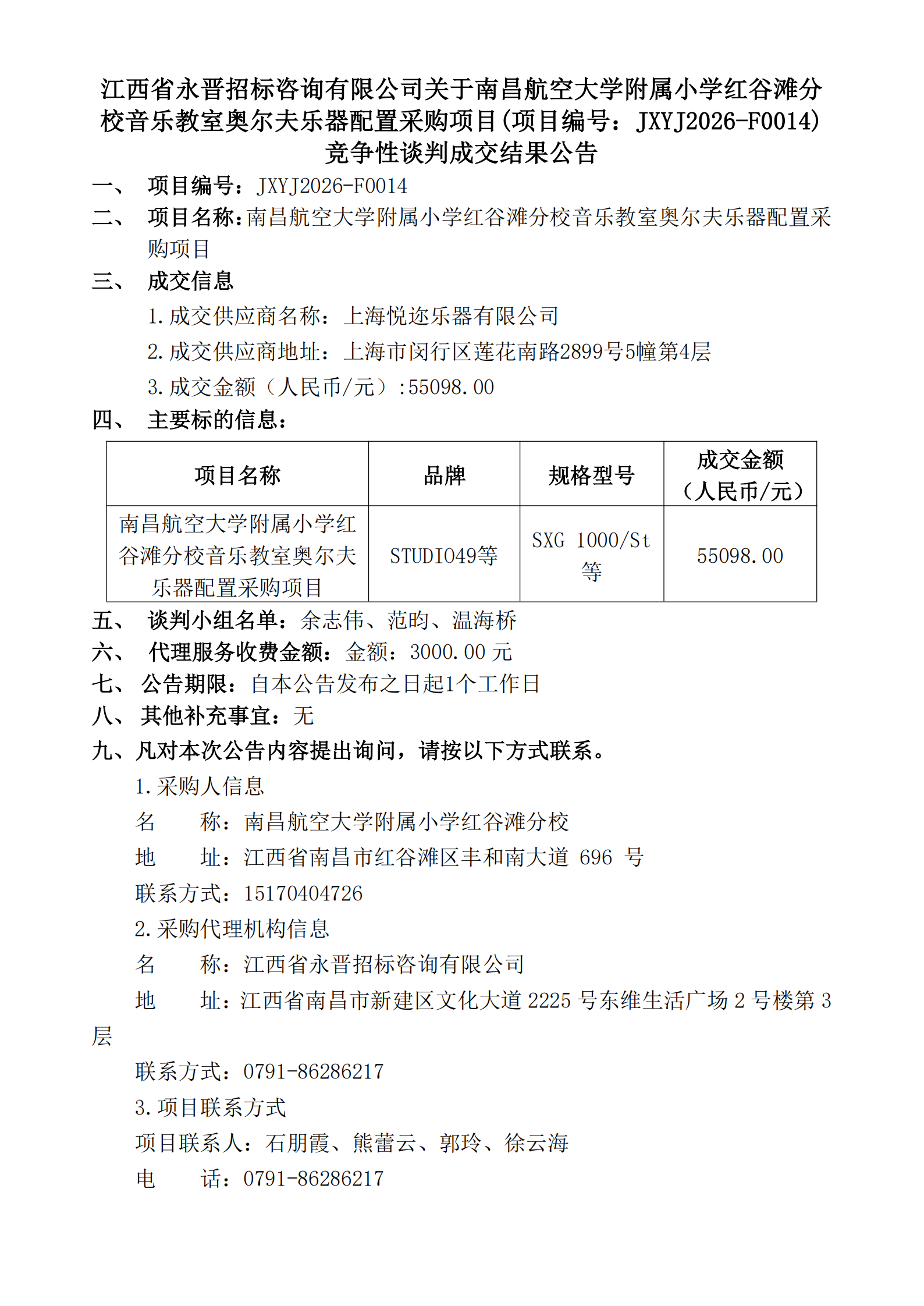 中国·yl23411永利关于南昌航空大学附属小学红谷滩分校音乐教室奥尔夫乐器配置采购项目(项目编号:JXYJ2026-F0014)竞争性谈判成交结果公告