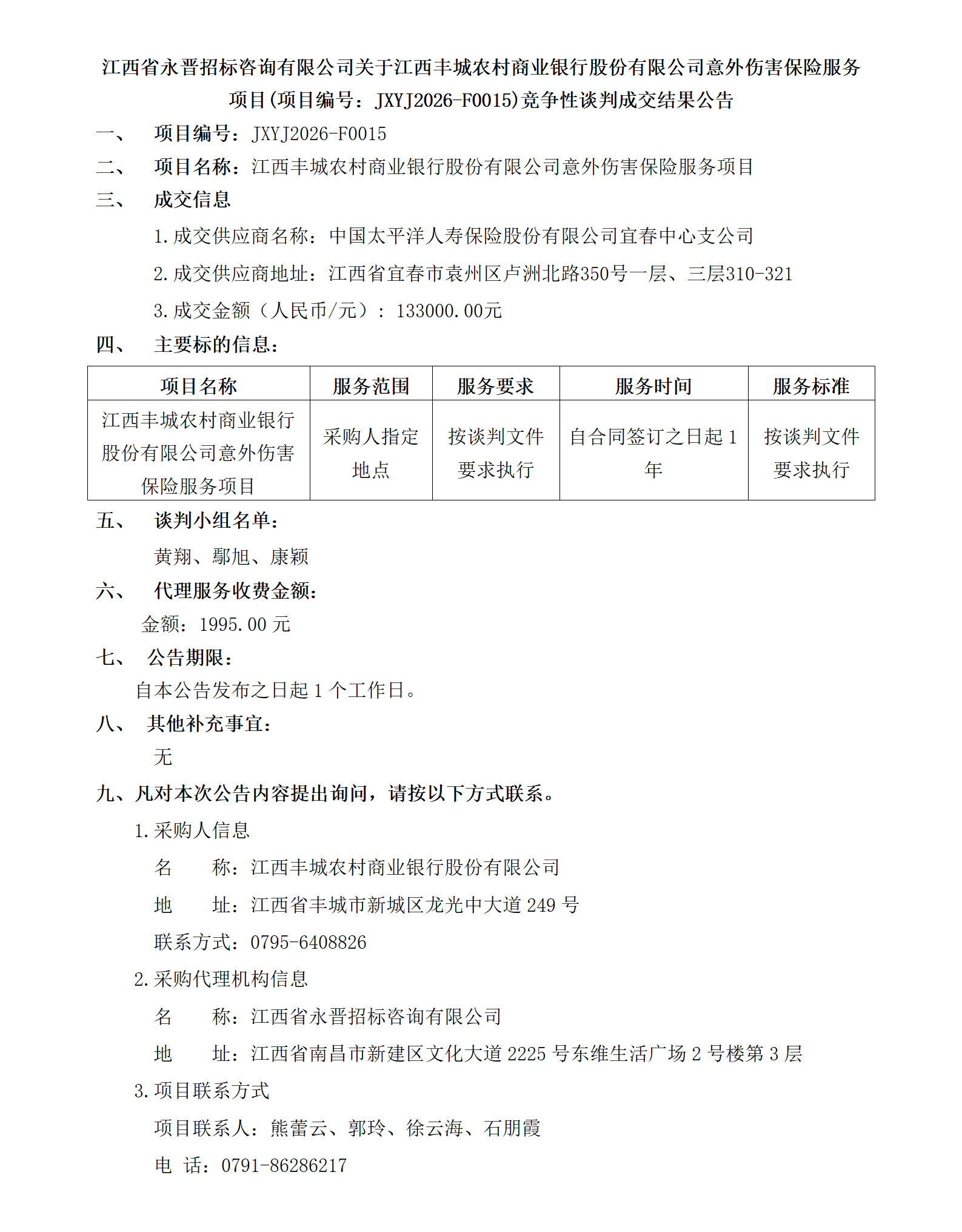中国·yl23411永利关于江西丰城农村商业银行股份有限公司意外伤害保险服务项目(项目编号:JXYJ2026-F0015)竞争性谈判成交结果公告